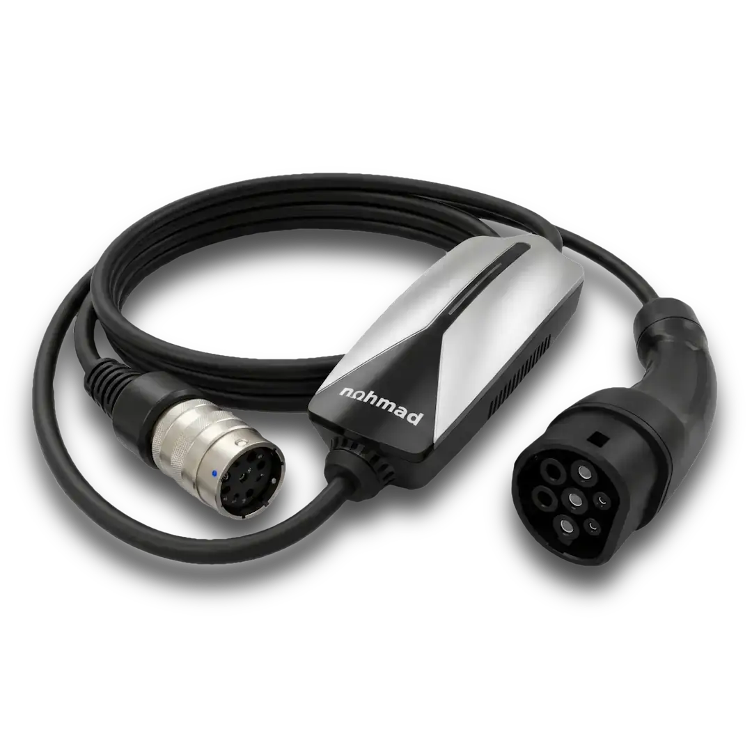 A configurable portable EV charger with swappable plugs allowing 10A or 15A charging. Use the Nohmad app to monitor charging sessions, track energy use and control charging from anywhere. Compatible with third-party OCPP charging platforms.